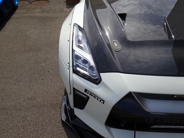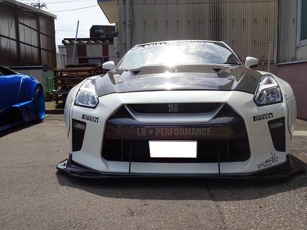 R35の専用ボディキットも充実しているリバティーウォークですが、今回はワイドボディキットではなくベース車両のデザインを活かしたLB★Performanceで、外付けリベット止めやフロントエプロンなどを装備しています。