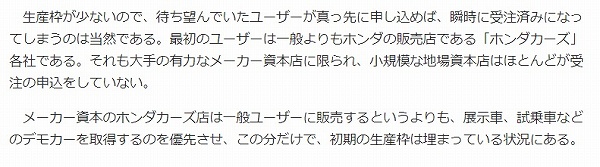 生産枠が少ないので、待ち望んでいたユーザーが真っ先に申し込めば、瞬時に受注済みになってしまうのは当然である。最初のユーザーは一般よりもホンダの販売店である「ホンダカーズ」各社である。それも大手の有力なメーカー資本店に限られ、小規模な地場資本店はほとんどが受注の申込をしていない。