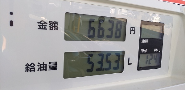 ちなみに給油完了後の航続可能距離は上の青四角にある通り598kmとなっています(前回は571kmだったので、生涯燃費が向上したこともあって航続距離も増えた)。