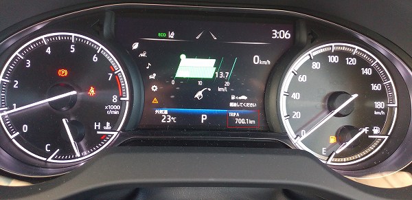 新型ハリアー・ガソリンZの航続可能距離が0kmになったときの走行距離は2,084kmだったので、そこから更に46km(ODO2038km)走行していますが、ガソリンタイプの燃費から換算すると、ざっくり4Lぐらいの燃料を消費したことになります(ガソリンモデルのWLTCモードは15.4km/Lであるものの、市街地モードは11.3km/Lと低めなので、低めに見積もって約10km/Lぐらいで換算しています)。