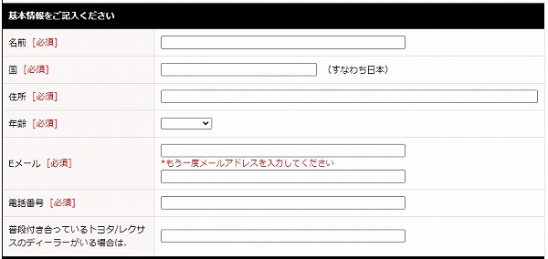 基本情報は上の通り、購入希望者の氏名や住所、年齢、メールアドレス、電話番号、最寄りのディーラーなど、このあたりは従来と変わらずですね。