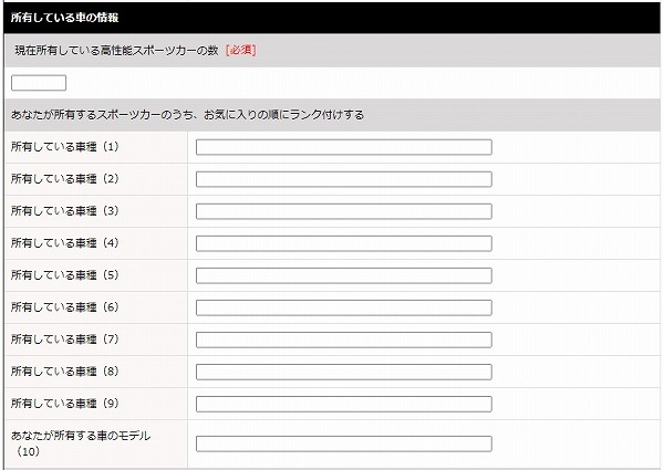 単なるスポーティカー/スポーツカーではなく、ランボルギーニやフェラーリ、マクラーレン、ポルシェといったスーパーカー/ハイパフォーマンススポーツカーが対象になってくるようで、最低10台の入力欄が設けられています(具体的な車種に関しては任意だが、記入した方が意思力や説得性は高いと思われる)。