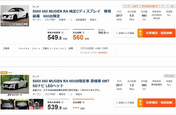 そしてインターネット中古車サイト・カーセンサーなどをチェックしてみると、既に一部のS660は500万円超えのプレ値が付いている模様。
