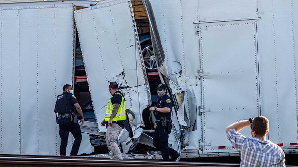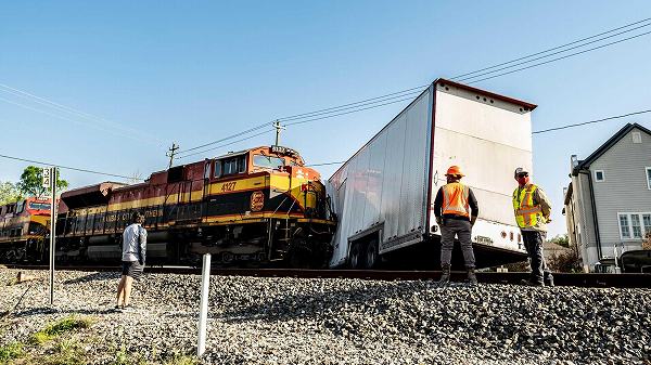 この事故は2021年4月1日に発生したもので、セミトラックが踏切を通過しようとしたところ、踏切途中で立ち往生してしまい、その後ゆっくり走行してきた列車と衝突してしまったそうです。