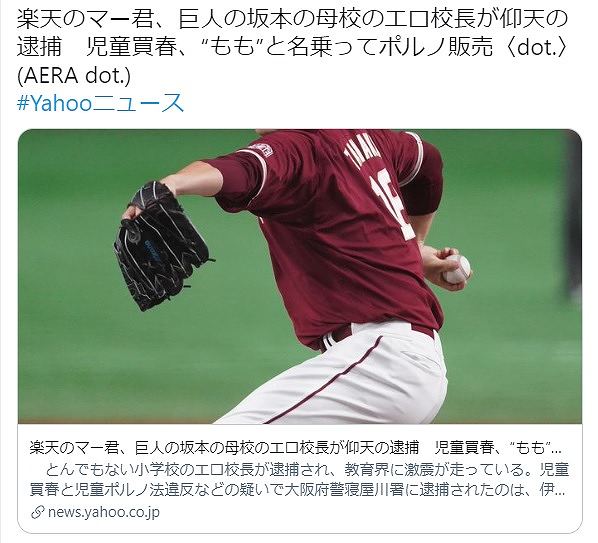 それ見てクリックした私も偉そうに言えんけど楽天のマー君、巨人の坂本の母校のエロ校長が仰天の逮捕 児童買春、“もも”と名乗ってポルノ販売〈dot.〉(AERA dot.)#Yahooニュースhttps://t.co/qA0wo683oj