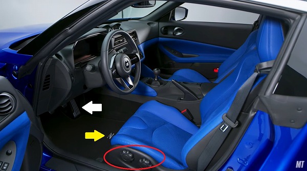 そして黄矢印を見ていくと、”Z”のロゴ付きフロアマットが採用され、アクセルペダルは吊り下げ式ではなくオルガン式が採用されています。