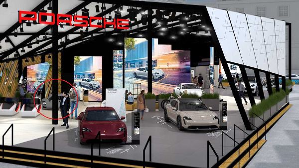 ブース内にはピュアEVモデルの新型タイカン(Porsche New Taycan)/タイカンクロスツーリスモ(New Taycan CrossTurismo)が展示されていますが、何やら左側の赤丸部分に見慣れないモデルが…