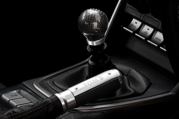 センターコンソールを見ていくと、6速MTのシフトノブはカーボンファイバ製、手引き式のハンドブレーキにはTOM’Sのロゴ付きとなるアルミの削り出しを採用しています。