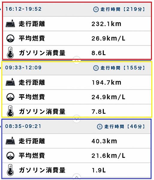 その後の黄四角を見ていくと、走行距離194.7kmのほぼ9割以上が高速道路走行となり、且つ後半は下りが多いため、走行距離に対してのガソリン消費量が7.8Lと少なく、平均燃費も24.9km/Lと少し向上しているのがわかります。