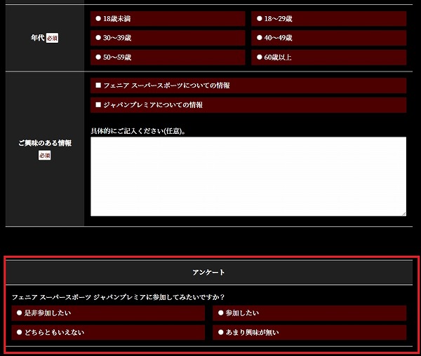 こんな感じで、フェニアスーパースポーツに関して「どれだけの関心があるのか?」を確認するためのアンケートが設けられています。