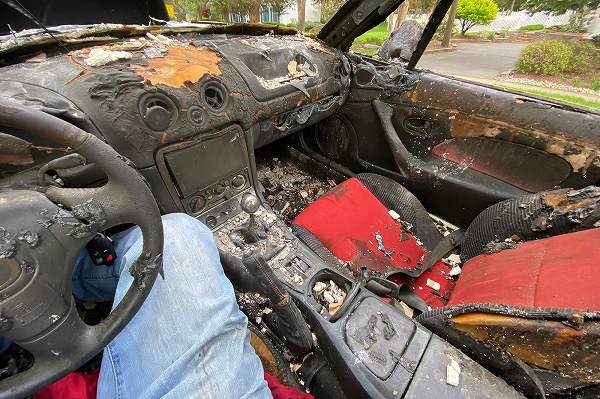 これが火災でボロボロになってしまったマツダ・ロードスターの内装だ