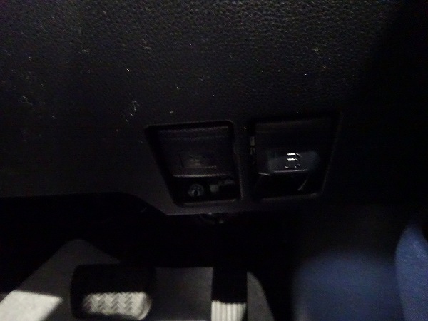 少し見づらいですが、運転席と足元のペダルとの中間付近に、フロントボンネットレバーとフューエルリッド(給油蓋)用のレバーが設けられていました。