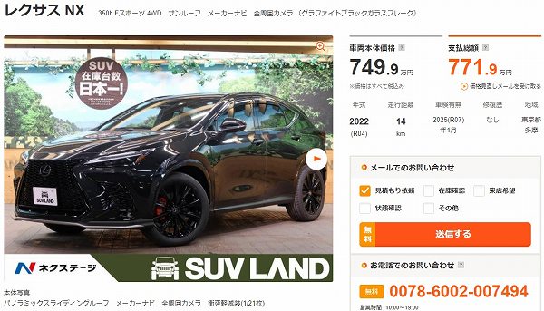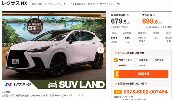 レクサス新型NXも立て続けに2台カーセンサーに出品!