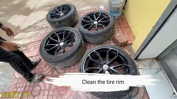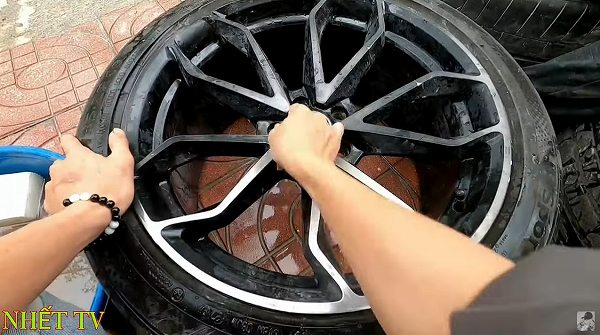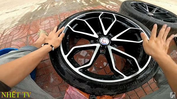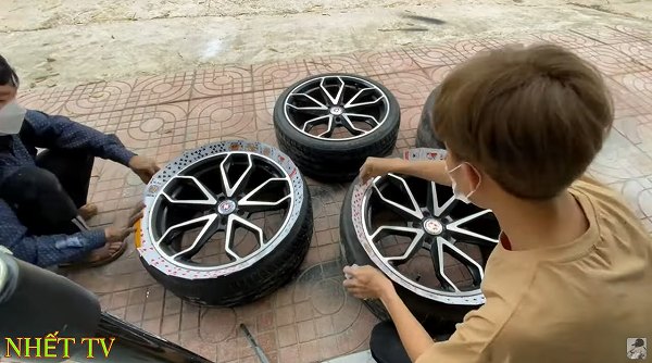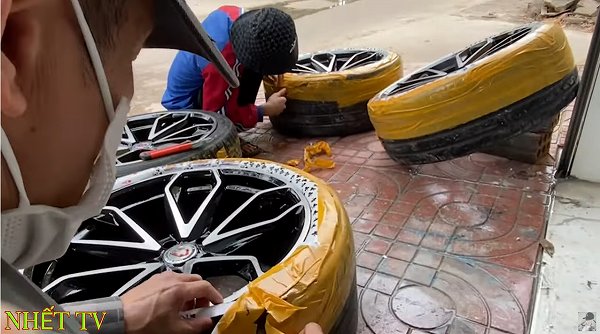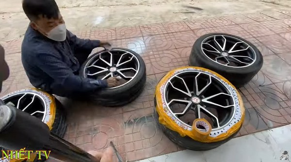 本来であればタイヤを外しての作業になるわけですが、タイヤを取り外す機器類が無いために、こうしたユニークなアイデアでホイールをコーティングするとは…