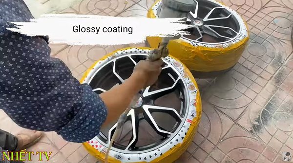 何とタイヤの外面に吹き付けないようにホイールのグロスコーティング!