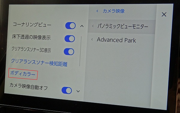 そうすると「カメラ映像」の設定項目が表示されるので、左下の赤四角にある「ボディカラー」をタッチしてみてください。