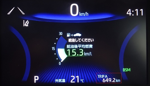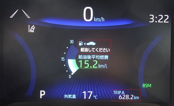給油警告灯が点灯した際のTrip Aメーターが590.8kmで、航続可能距離が0kmになったあとには628.2kmだったため、37.4km走らせたことになります。