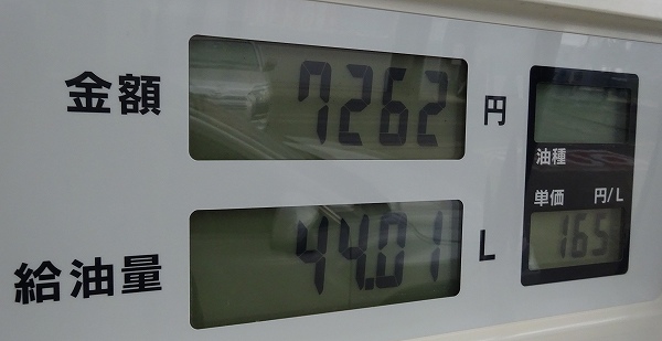 給油量は44.01Lと、カタログ表記の燃料タンク47Lに対して2.99L残しとなりました(結構残りましたね)。