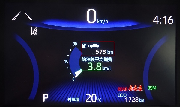 ちなみに満タン給油後の航続可能距離は573kmと少な目ですが、燃費が向上すれば航続距離の減り方も遅くなるので、あくまでも目安程度の数値として見た方が良いかと思います。
