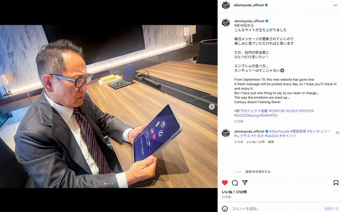 ちなみに今回の新規プロジェクトについて、トヨタCEOである豊田章男 氏も公式インスタグラムにて反応していますが、以下のように「センチュリーの並び」について激怒しています。