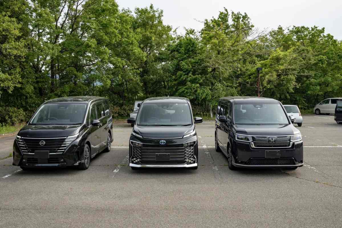 こちらが、左から日産セレナ e-POWER LUXION (C28)とトヨタ・ヴォクシー HEV S-Z、そしてホンダ・ステップワゴン e:HEV SPADA PREMIUM LINEを同時3台並べた画像。