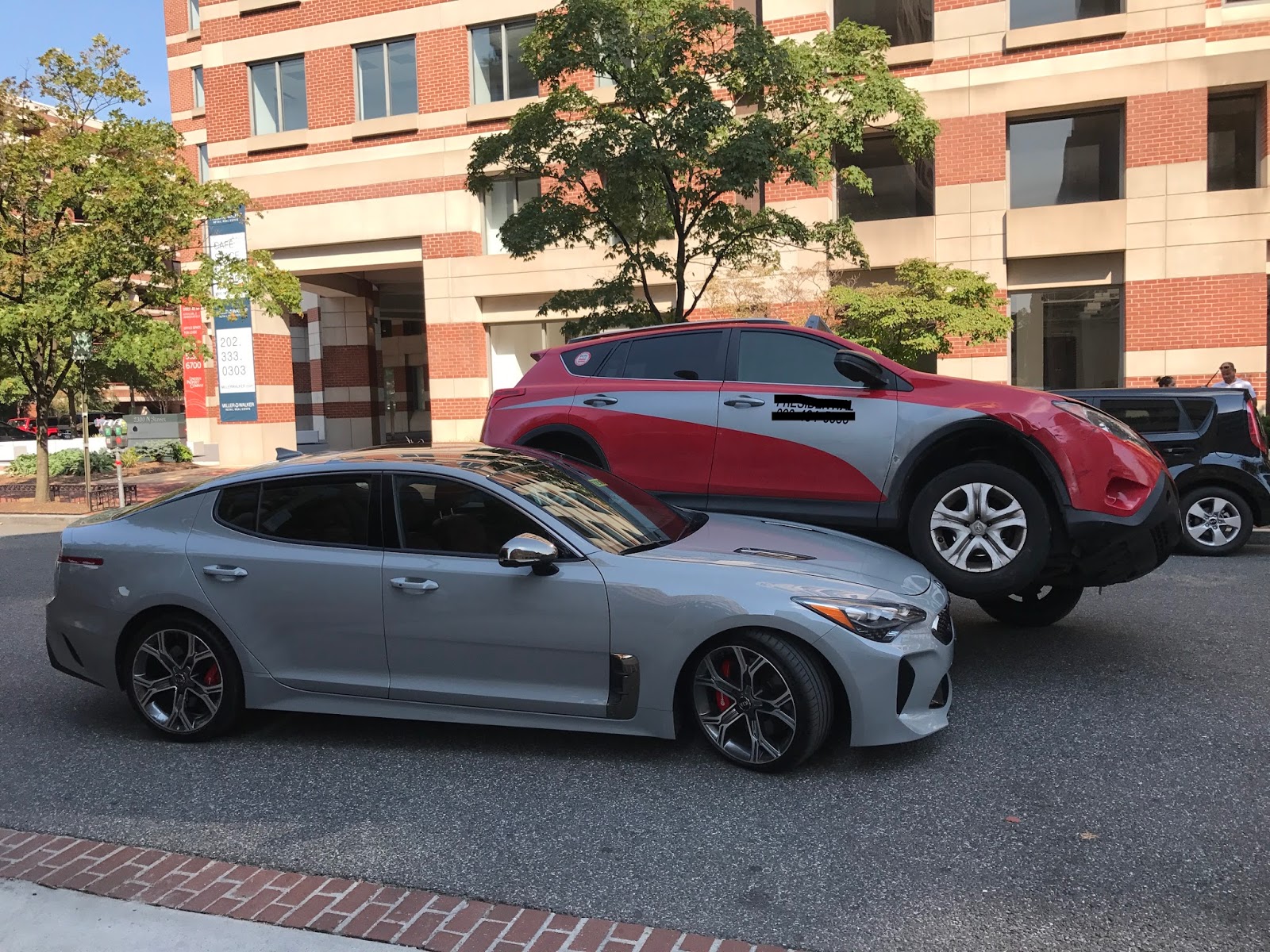 こちらの個体、まだアメリカでは販売されていないため、恐らく何かのイベント又は展示用に使用されるものと思われますが、たまたま、路上駐車しているときに、後ろから走行してきたトヨタ「RAV4」が「スティンガー」に乗り上げるような事故に。