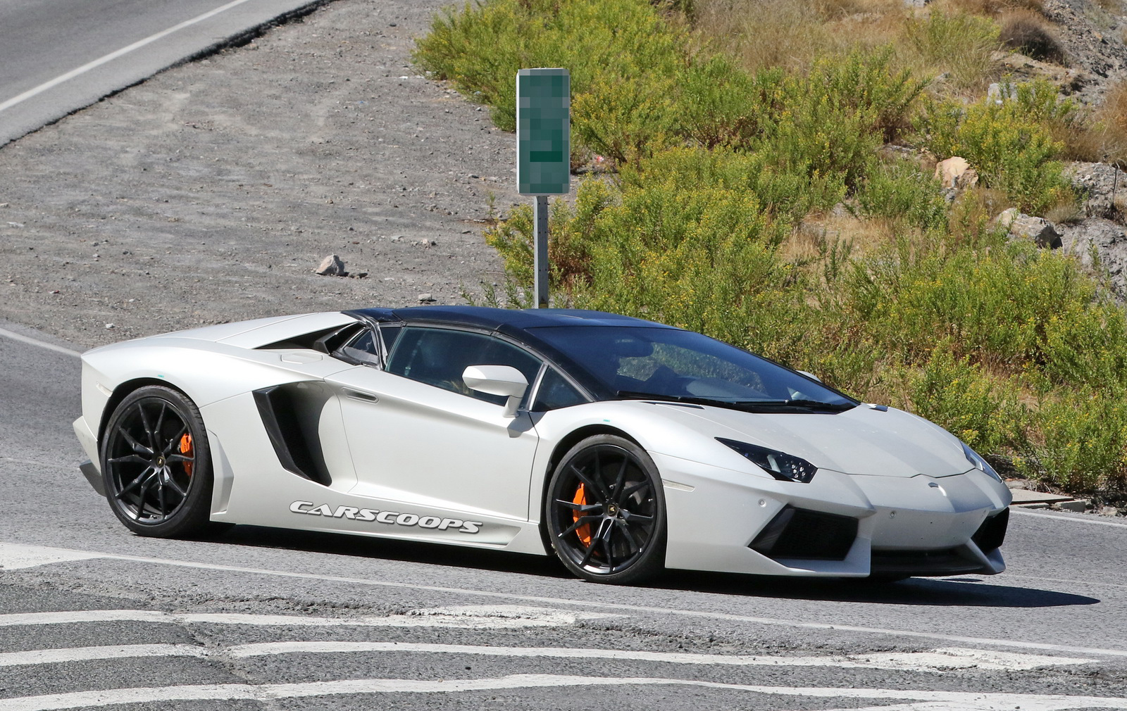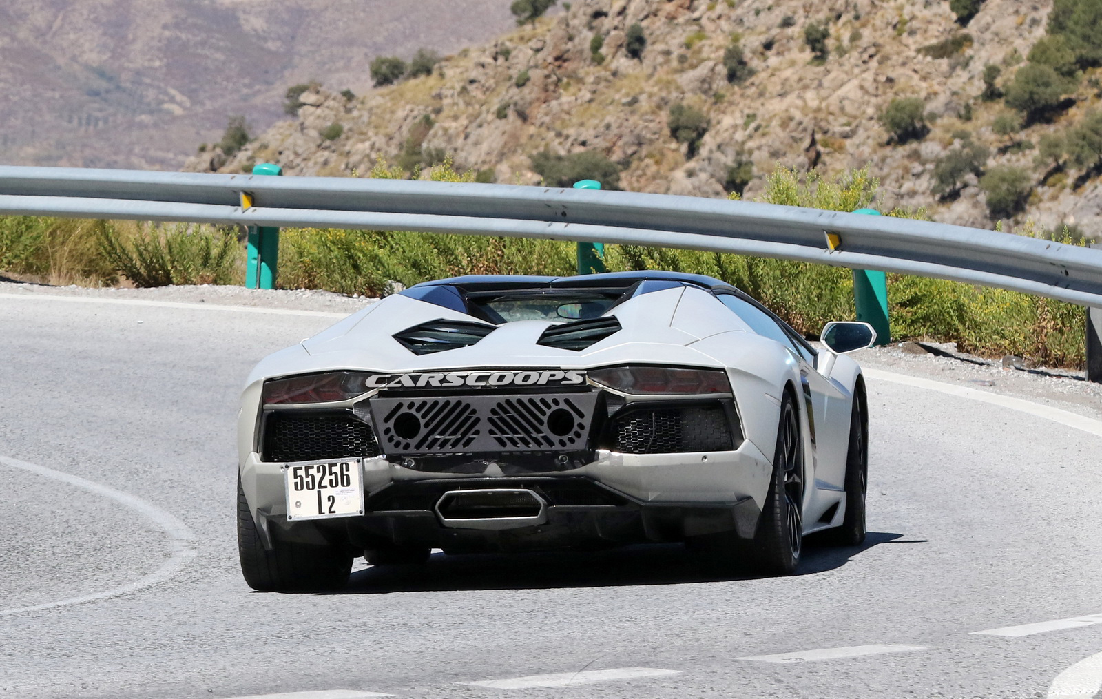 フロントのデザインやルーフを確認していくと、「アヴェンタドール・ロードスター」のように見えますが、リヤデザインを確認していくと「ウラカン・ペルフォルマンテ」と同様のデュアルエキゾーストシステムを配備(テスト車両なので、確実なデザインではないが…)していることが確認できます。