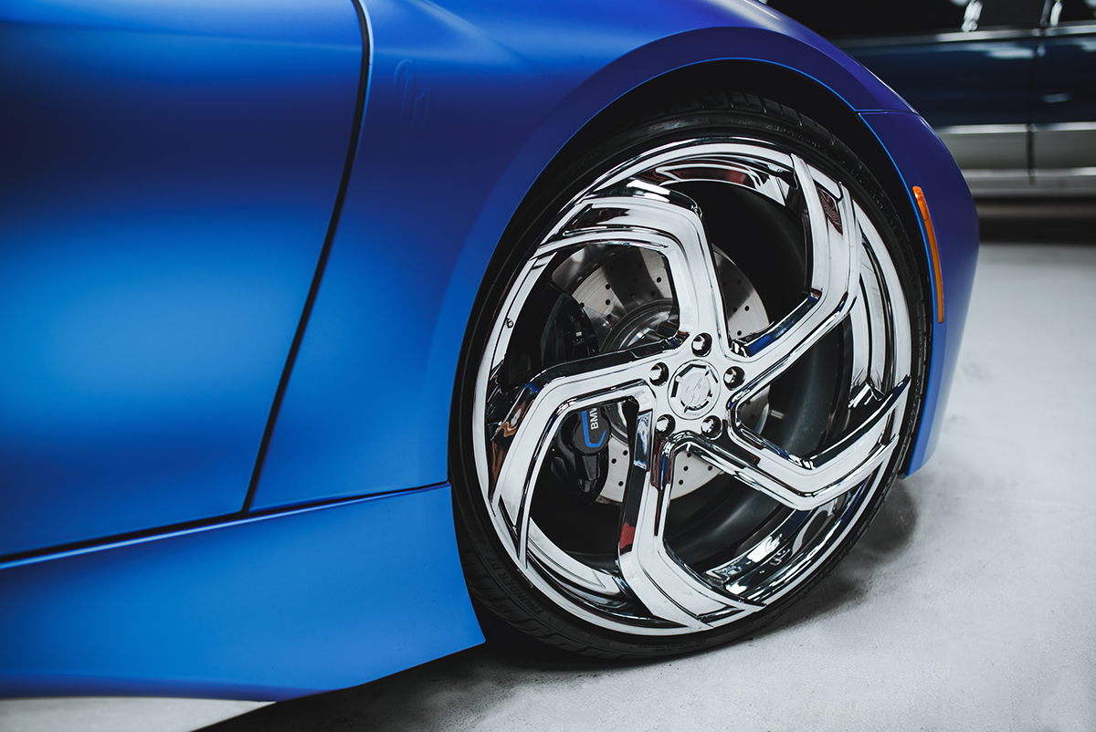 「i8」は、ボディパネル全体にサテンブルーのクロムラッピングを施す一方、ルーフやサイドミラ、フロントボンネットの一部をブラックにすることで、メリハリのあるボディに。