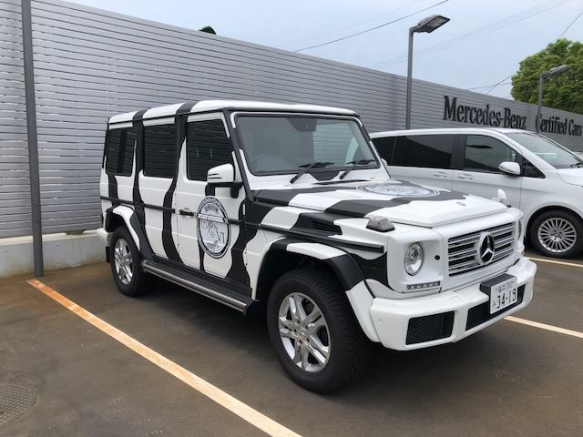 今回のイベントの中で、最も気になるものが以下のホワイトとブラックのゼブラ柄ラッピングカー試乗体験(写真はメルセデスベンツ「Gクラス」とポルシェ「カイエン」)。