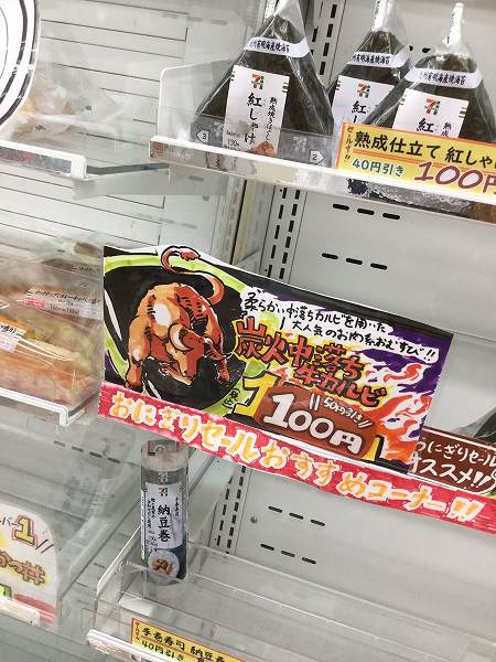 某所のコンビニ・セブンイレブンにあるおにぎりコーナーにて、「炭火中落ち牛カルビ」おにぎりをオススメするプレートが大きな話題を呼んでいます。