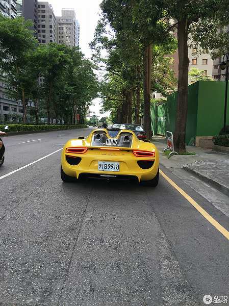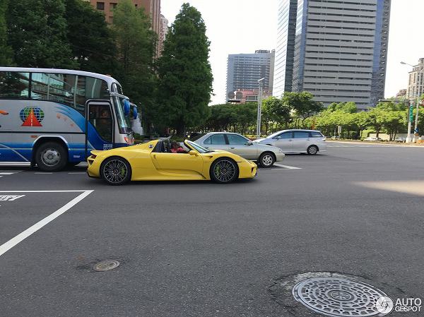 台湾の台中市にて、何とも珍しいイエローカラーのポルシェ「918スパイダー」が目撃に。
