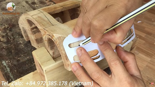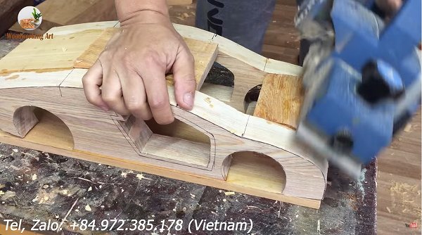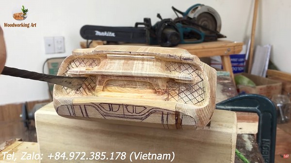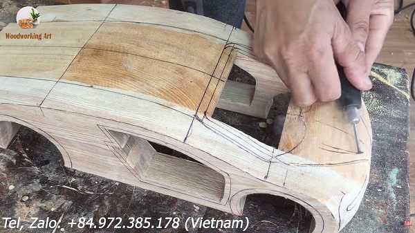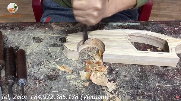 ここからいよいよサイドパネルやフェンダー等のボディラインを作っていくため、どんどん木の表面をくり抜いていきます。