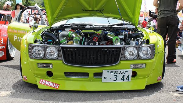 こちらのモデル、岡山県のコーチビルダー・三好自動車とTRA京都によって過激カスタムされたモデルとのことで、ぱっと見は「サバンナ(RX-3)」のようにも見えるのですが、中身は「RX-7」という何とも珍しいインスピレーションモデル(LB-Worksのステッカーもあるため、リバティーウォークカスタムも含まれている?)。