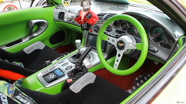リヤテールランプは「RX-7」そのままに、若干のスモークが加味されている印象で、その上にはアシッドグリーンのデッキリッドスポイラーを装備。